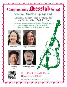 The Community Messiah Sing is an annual December event hosted by UU Wellesley Hills. All members of the congregation and people of all ages from the surrounding community are invited to our Sanctuary to enjoy this seasonal classic, whether singing along or listening.