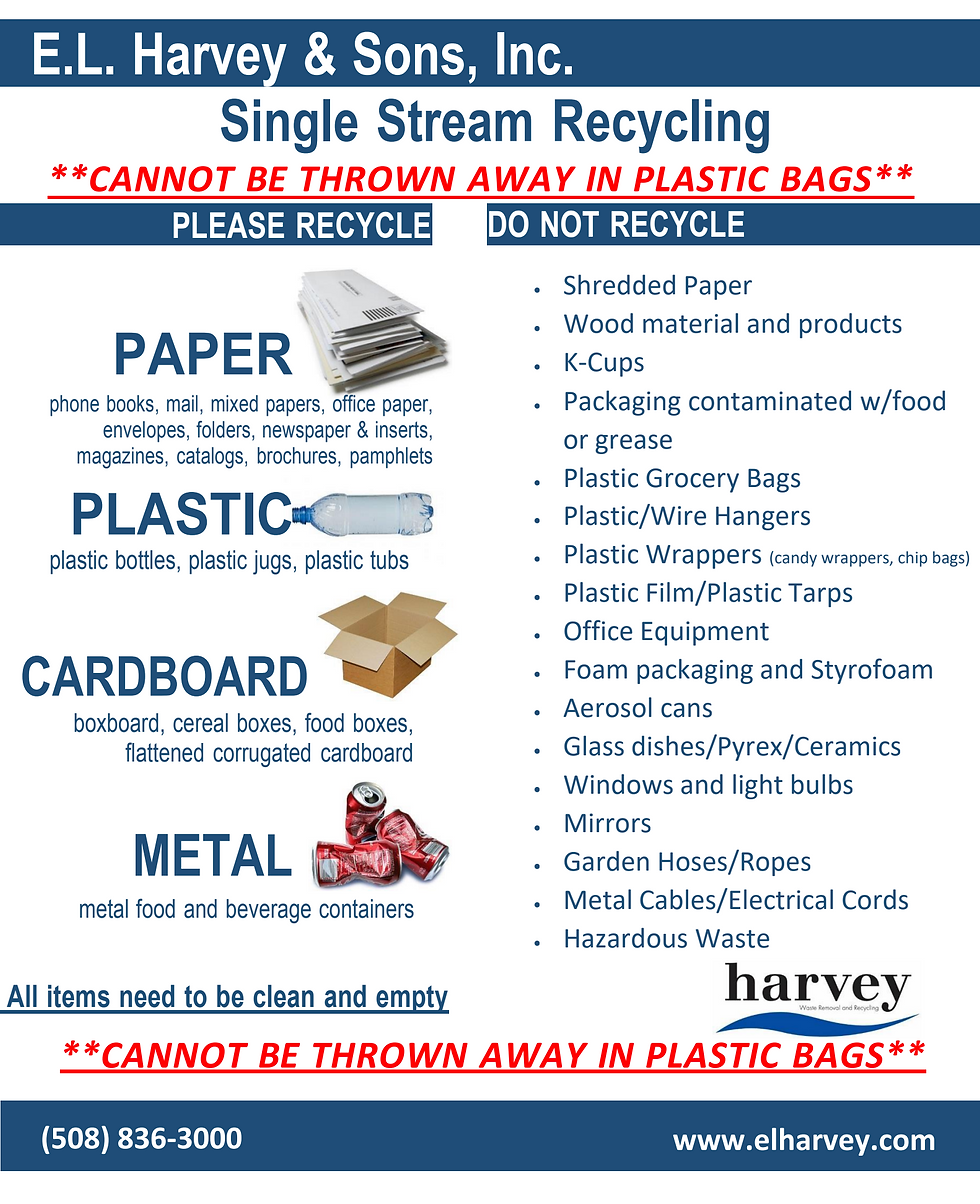 We have a new arrangement with our solid waste and recycling vendor. Four of the eight gray bins outside in the parking lot have been designated for single stream recycling. This means that paper, cardboard, plastic, glass and metal can all go into these containers. Trash should go in the other four containers.